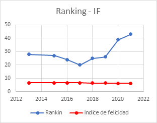 Actualmente el país se encuentra en la posición 43 del ranking de felicidad con un índice de 6,172. Este ha venido disminuyendo a través de los últimos años pasando de estar en el puesto 20° en el año 2017, esto puede deberse al estallido social presentado recientemente y aún encontrarse en un punto donde puede incrementar nuevamente.